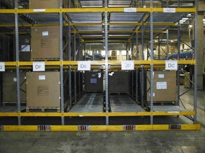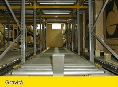 I magazzini a gravità si basano su scaffalature corredate da rulliere su cui vengono posizionati i pallet e/o scatole gestendo lo stoccaggio della merce secondo la logica FIFO (first in – first out). Questa soluzione si rende indispensabile in presenza di merce deperibile, ma può essere sfruttata quando occorre effettuare il carico della merce da un lato dell’impianto e lo scarico da quello opposto. Le scaffalature sono infatti dotate di piani a rulli opportunamente inclinati che consentono l’accumulo per gravità delle unità di carico.